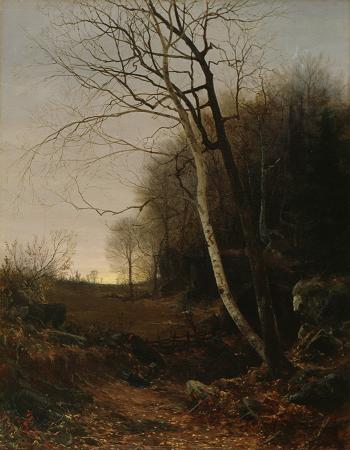 Jervis McEntee (1828 - 1898). Jervis McEntee was an American painter of the Hudson River School. He is a somewhat lesser-known figure of the 19th-century American art world, but was the close friend and traveling companion of several of the important Hudson River School artists. Aside from his paintings, McEntee's journals are an enduring legacy, documenting the life of a New York painter during and after the Gilded Age. McEntee was born in Rondout, New York on July 14, 1828. Little is known of his childhood. From approximately 1844-1846, he attended the Clinton Liberal Institute in Clinton, New York. He exhibited his first painting at the National Academy of Design in New York City in 1850. The following year he apprenticed with Frederic Edwin Church, who was then regarded as a rising star in the American art world. Church and McEntee remained lifelong friends, though McEntee never approached Church's fame and fortune. After studying with Church, McEntee attempted a career as a businessman in Rondout, but did not experience much success. After three years he gave up business and devoted himself wholly to his art, becoming one of the charter residents of Richard Morris Hunt's Tenth Street Studio Building in 1857. Since many of the building's other occupants were bachelors or commuters, McEntee and his wife became the center of a spontaneous salon frequented by some of the best-known artists, writers, and actors of the era. After his wife died in 1878, McEntee stayed on at the building, an increasingly lonely widower, until his death in 1891. McEntee was a particularly close friend of Hudson River School artists Sanford Robinson Gifford, Worthington Whittredge, John Ferguson Weir, as well as figurative painter Eastman Johnson. He was made an associate of the National Academy of Design in 1860, and a full academician in 1861. In 1869 he visited Europe, painting much in Italy. He died on January 27, 1891 of Bright's disease and is buried in Montrepose Cemetery in Kingston, New York. The landscapes of Jervis McEntee are known for their melancholy and poetic mood. The sky is often cloudy in a McEntee landscape, the season autumn. While Jasper Francis Cropsey and other artists typically painted bright fall foliage, McEntee often captured the season near its end, with the leaves faded and falling from the trees. Some people call my landscapes gloomy and disagreeable, McEntee wrote in his journal. They say I paint the sorrowful side of nature But this is a mistake. Nature is not sad to me but quiet, pensive, restful. Aside from his paintings, McEntee's enduring legacy are the detailed journals he kept from the early 1870s until his death. These diaries provide a vivid, accurate impression of the life of a typical New York painter during and after the Gilded Age. In his writings, McEntee records a detailed account of Hudson River School artists, their day-to-day life, gossip and personal reflections, and the overall arc of the American art world in the second half of the 19th century. He discusses his artistic successes and trials, particularly as money becomes more scarce with the decline in popularity of Hudson River School art. The journals contain first-hand information on the inner workings of the National Academy and the Century Club, on the 1876 Centennial Exposition in Philadelphia, efforts to revive the American Art-Union, and on the vigorous growth of art societies and exhibitions throughout the country. The diaries also reveal the economy of art during the period, including the prices, patterns of collecting and patronage, the artists' dependence on personal contacts through clubs, social gatherings, and influential friends. Long passages describe McEntee's overwhelming anxieties over money and family difficulties; he is frequently lonely and depressed, and always worried about his status as an artist. McEntee's journals are now kept by the Archives of American Art, a research center within the Smithsonian Institution. Five volumes of these diaries, from 1872 to 1890, have been digitally scanned, transcribed, and can be browsed in their entirety online. In addition, the Archives holds McEntee's personal papers, which were digitized in 2007.