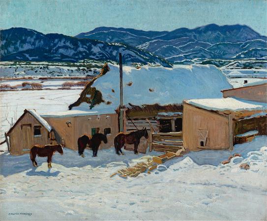Ernest Martin Hennings (1886 - 1956). Ernest Martin Hennings was an American artist and member of the Taos Society of Artists. E. Martin Hennings was born in Penns Grove, New Jersey on February 5, 1886 to German immigrant parents. Two years after he was born, Hennings' father moved his family to Chicago. Looking back on his early exposure to art and his decision to pursue a life as an artist, Hennings remarked; It was rather strange that I chose painting for my profession, for practically none of my family showed any artistic tendencies. It happened that when I was 12 or 13 years old, another lad and myself wandered into the Art Institute of Chicago and it was during that visit that I determined to become an artist. That day I secured a pamphlet that showed me that art could be studied. That had never occurred to me. It was in 1901 that Hennings began taking classes at the School of the Art Institute of Chicago, which was largely based on the great European art schools and made particularly emphasis on the importance of drawing. On June 17, 1904, he graduated from the school with honors, but continued to study there for another two years, mostly under the instruction of John Vanderpoel. Hennings eventually took up work as a commercial artist, mostly painting murals and portraits around Chicago. Murals on which Hennings worked, usually on canvas panels, include one for the cafeteria at the Art Institute of Chicago, the Florentine Ballroom at the Congress Plaza Hotel in Chicago, and The Ascension, a mural painted for the Grace Episcopal Cathedral in Topeka, Kansas. Out of a desire to return to fine art painting, he re-enrolled at the School of the Art Institute of Chicago, and soon entered, in 1912, a painting in a competition at the Ecole des Beaux-Arts in Paris, for which he won second prize. He soon enrolled at the Academy of Fine Arts, Munich in Germany, under the direction of Angelo Junk, Walter Thor, and Franz von Stuck, who was particularly influential on the painter. In January 1914, Hennings became a member of the American Artists Club in Munich, Germany with Victor Higgins and Walter Ufer, who would both later become fellow Taos Society of Artists. Before World War I escalated, Hennings relocated back to his hometown of Chicago and initially resided at the Fine Arts Building on Michigan Ave, where Louis Grell joined him for a short period before the two moved studios to the famous Tree Studio artist colony in Chicago's North side. At this time Hennings also joined the artist run Palette and Chisel Academy of Fine Art, and by 1916 had already gained respect in Chicago with a number of awards, including a Gold Medal from the Palette and Chisel Club as well as the Englewood Women's Club prize at the Art Institute of Chicago. Hennings soon attracted the attention of a number Chicago businessmen and art patrons, including Carter H. Harrison, Jr. Harrison offered to sponsor a trip for Hennings to visit and paint in Taos, New Mexico, in exchange for the works he completed during his stay. Hennings was not the first to receive such a proposition; Walter Ufer and Victor Higgins had both been approached by Harrison three years earlier, and soon settled permanently in the Southwest. Hennings accepted the patrons proposition and spent the summer and fall of 1917 in and around Taos. Harrison supplied Hennings with an introduction to the newly created New Mexico Museum of Art in Santa Fe, New Mexico. For the inaugural exhibition at the museum Hennings exhibited three paintings. In that year, 1917, Hennings exhibited his first painting in the United States, outside of Chicago, at the National Academy of Design in New York City, New York. Although Hennings soon traveled back to Chicago to continue his work as a commercial artist, three years later he moved permanently to Taos. His new home allowed Hennings to expand past the limitations of commercial art, to paint freely. In particularly the artist was able to freely travel around the area surrounding Taos, painting en plein air subjects of intense natural beauty in remarkable light, none of which would have been possible in Chicago. In part due to his academic education, Hennings' primary interest was in portrait painting, with his primary subject being the Native Americans living in and around Taos Pueblo. While continuing to paint predominantly in the Southwest, Hennings frequently exhibited in Chicago. In 1922 he was awarded the Clyde M. Carr Prize from the Art Institute of Chicago as well as the Institute's Fine Arts Building Prize. The following year his success in his hometown continued with the Martin B. Cahn Prize, again from the Art Institute of Chicago, for his painting The Twins.