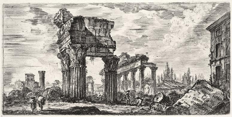 Temple of Saturn (c300). The Temple of Saturn was an ancient Roman temple to the god Saturn. Its ruins stand at the foot of the Capitoline Hill at the western end of the Roman Forum. The original dedication of the temple is traditionally dated to 497 BC, but ancient writers disagreed greatly about the history of this site. Construction of the temple is thought to have begun in the later years of the Roman Kingdom under Tarquinius Superbus. Its inauguration by the consul Titus Lartius took place in the early years of the Republic, making it the oldest Republican temple after the Temple of Jupiter Optimus Maximus. The altar of Saturn, which stood in front of the temple, is thought to have been much older and was associated with Saturn's founding of the city on the Capitoline HIll. The temple was completely reconstructed by Munatius Plancus in 42 BC. The present ruins represent the third phase of the Temple of Saturn, which was built after a fire in 360 AD. The extant inscription on the frieze commemorates this restoration undertaken after the fire. This late 4th century rebuilding reflects pagan revivalism during this time period. In Roman mythology, Saturn ruled during the Golden Age, and he continued to be associated with wealth. His temple housed the treasury, the aerarium, where the Roman Republic's reserves of gold and silver were stored. The state archives and the insignia and official scale for the weighing of metals were also housed there. Later, the aerarium was moved to another building, and the archives transferred to the nearby Tabularium. The temple's podium, constructed out of concrete covered with travertine, was used for posting bills. Collapse has left little standing but the remains of the front porch. The partially preserved pediment displays the inscription: Senatus Populusque Romanus incendio consumptum restituit meaning The Senate and People of Rome restored consumed by fire. The pediment and eight surviving columns represent one of the iconic images of Rome's ancient architectural heritage. Except for the Ionic columns capitals carved in the Late Antique style, all of the materials remaining were taken from other buildings. Examples of the spolia used to construct the Temple of Saturn include Egyptian granite column shafts and a late Republican acanthus frieze. Based on other cult images of Saturn, the statue of the god in the interior was veiled and equipped with a scythe. The image was made of wood and filled with oil. The legs were covered with bands of wool which were removed only on December 17, the day of the Saturnalia. On this feast day, slaves were allowed temporary freedom and family members exchanged gifts.