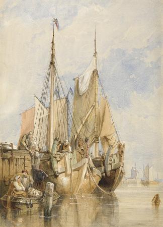 Clarkson Stanfield (1793 - 1867). Clarkson Frederick Stanfield was a prominent English marine painter, often inaccurately credited as William Clarkson Stanfield. Stanfield was born in Sunderland, the son of James Field Stanfield an Irish-born author, actor and former seaman, and Mary Hoad, an artist and actress. Stanfield was likely to have inherited artistic talent from his mother, who is said to have been an accomplished artist, but died in 1801. His father re-married, to Maria Kell, a year later. Stanfield was named after Thomas Clarkson, the slave trade abolitionist, whom his father knew, and this was the only forename he used, although there is reason to believe Frederick was a second one. He was briefly apprenticed to a coach decorator in 1806, but left owing to the drunkenness of his master's wife and joined a South Shields collier to become a sailor. In 1808 he was pressed into the Royal Navy, serving in the guardship HMS Namur at Sheerness. Discharged on health grounds in 1814, he then made a voyage to China in 1815 on the East Indiaman Warley and returned with many sketches. In August 1816 Stanfield was engaged as a decorator and scene-painter at the Royalty Theatre in Wellclose Square, London. Along with David Roberts he was afterwards employed at the Coburg theatre, Lambeth, and in 1823 he became a resident scene-painter at the Theatre Royal, Drury Lane, where he rose rapidly to fame through the huge quantity of spectacular scenery and dioramas which he produced for that house until 1834. Stanfield abandoned scenery painting after Christmas 1834, though he made exceptions for two personal friends. He designed scenery for the stage productions of William Charles Macready, and for the amateur theatricals of Charles Dickens. Stanfield partnered with David Roberts in several large-scale diorama and panorama projects in the 1820s and 1830s. The newest development in these popular entertainments was the moving diorama or moving panorama. These consisted of huge paintings that unfolded upon rollers like giant scrolls; they were supplemented with sound and lighting effects to create a nineteenth-century anticipation of cinema. Stanfield and Roberts produced eight of these entertainments; in light of their later accomplishments as marine painters, their panoramas of two important naval engagements, the Bombardment of Algiers and The Battle of Navarino, are worth noting. An 1830 tour through Germany and Italy furnished Stanfield with material for two more moving panoramas, The Military Pass of the Simplon and Venice and Its Adjacent Islands. Stanfield executed the first in only eleven days; it earned him a fee of E300. The Venetian panorama of the next year was 300 feet long and 20 high; gas lit, it unrolled through 15 or 20 minutes. The show included stage props and even singing gondoliers. After the show closed, portions of the work were re-used in productions of Shakespeare's The Merchant of Venice and Otway's Venice Preserved. The moving panoramas of Stanfield and other artists became highlights of the traditional Christmas pantomimes. Meanwhile, Stanfield developed his skills as an easel painter, especially of marine subjects; he first exhibited at the Royal Academy in 1820 and continued, with only a few early interruptions, to his death. He was also a founder member of the Society of British Artists and its president for 1829, and exhibited there and at the British Institution, where in 1828 his picture Wreckers off Fort Rouge gained a premium of 50 guineas. He was elected Associate Member of the Royal Academy in 1832, and became a full Academician in February 1835. His elevation was in part a result of the interest of William IV who, having admired his St. Michael's Mount at the Academy in 1831, commissioned two works from him of the Opening of New London Bridge and The Entrance to Portsmouth Harbour. Both remain in the Royal Collection. Until his death he contributed a long series of powerful and highly popular works to the Academy, both of marine subjects and landscapes from his travels at home and in France, the Netherlands, Germany, Italy, Spain, and Ireland.