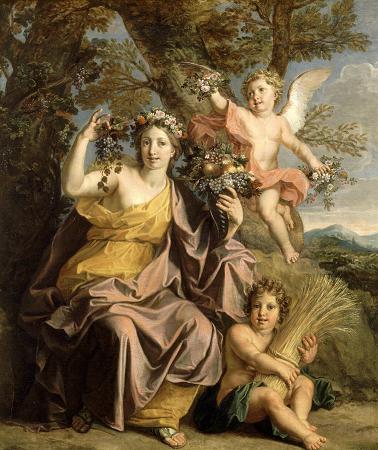 Abundantia. In ancient Roman religion, Abundantia was a divine personification of abundance and prosperity. She was among the embodiments of virtues in religious propaganda that cast the emperor as the ensurer of Golden Age conditions. Abundantia thus figures in art, cult, and literature, but has little mythology as such. She may have survived in some form in Roman Gaul and medieval France. The Augustan poet Ovid gives Abundantia a role in the myth of Acheloüs the river god, one of whose horns was ripped from his forehead by Hercules. The horn was taken up by the Naiads and transformed into the cornucopia that was granted to Abundantia. On Neronian coinage, she was associated with Ceres and equated with Annona, who embodied the grain supply. Like Annona, Abundantia was a virtue in action in such locations as the harbor, where grain entered the city. Abundantia occurs in the context of Mithraic iconography on a vase from Lezoux, in the Roman province of Gallia Aquitania, which presents the most complete depiction of the act of bull-slaying that was central to the religion. Abundantia is seated and holds a cornucopia as an image of the abundance that stems from Mithras' act. It has been suggested that the Gallic goddess Rosmerta had a functional equivalence to Abundantia, but the two are never directly identified in inscriptions. William of Auvergne, a bishop of Paris, mentions a Domina Abundia, who also appears in the Roman de la Rose as Dame Habonde. The bishop derives her name from abundantia. At night the dominae enter houses where offerings have been set out for them. They eat and drink from the vessels, but the contents are undiminished. If they are pleased, they bring prosperity and fertility. William regarded these practices as a form of idolatry. Folklorists of the 19th century saw these figures as Celtic fairies. Nicholas of Cusa reports that on his travels through the French Alps in 1457, he met two old women who told him they were in the service of Domina Abundia. They identified themselves as apostate Christians, and had been imprisoned for witchcraft. Nicholas felt that they had been deluded by the devil, but should be allowed to receive penance rather than burning at the stake. In later Western art, Abundantia is often portrayed holding her cornucopia and sheaves of corn or wheat.